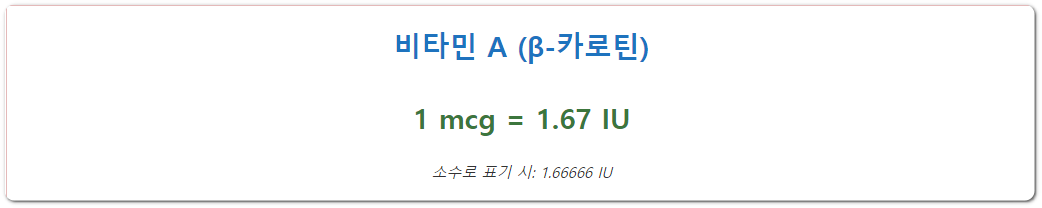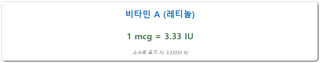 그리고 위의 이미지와 같이 레티놀, 베타카로틴이냐에 따라서 IU로 환산되는 수치가 다르기 때문에 가장 정확한 것은 국제단위 변환기 사이트에 들어가셔서 원하는 비타민 종류를 선택하고 원하는 단위로 변환하는 것입니다.