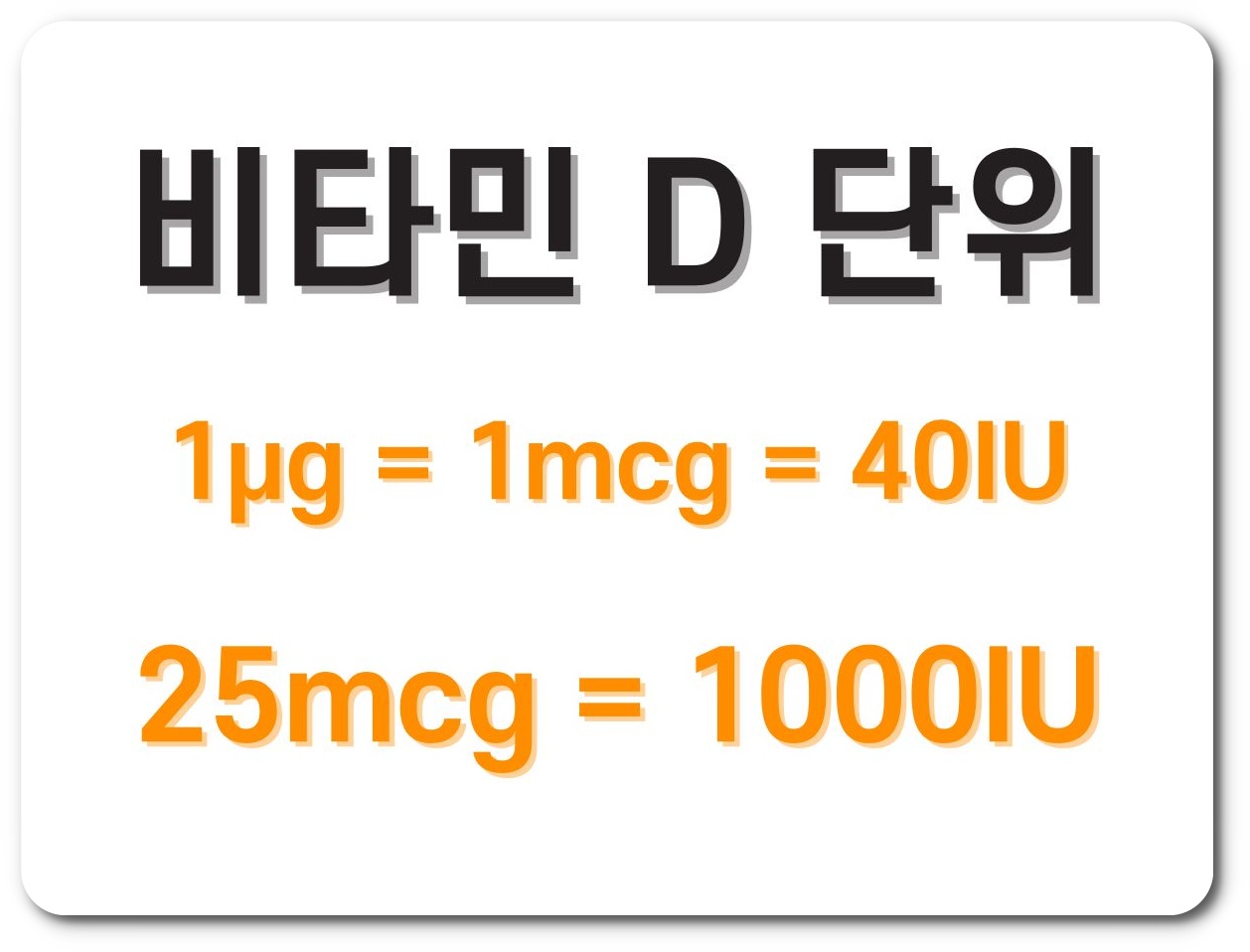 비타민 D의 단위 변환은 위의 이미지와 같이 1mcg = 1000IU로 환산할 수 있습니다. 여기서 IU를 정확하게 설명하자면, 활성도를 측정하는 것이기 때문에, 다른 물질들과 IU를 비교하기는 조금 어렵습니다.