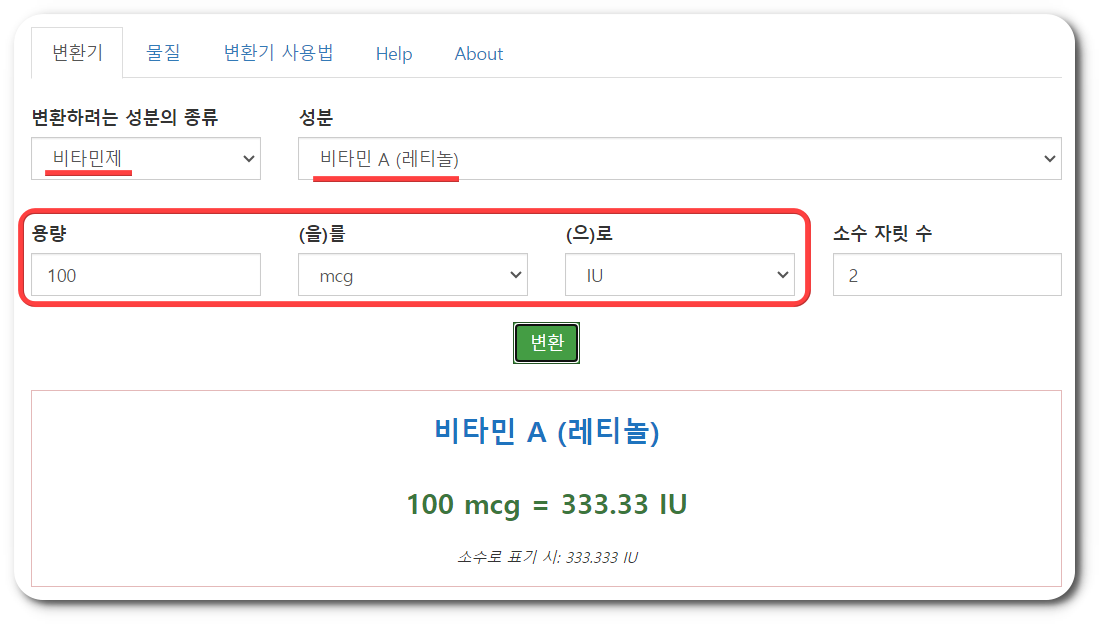 그리고 위의 이미지와 같이 레티놀, 베타카로틴이냐에 따라서 IU로 환산되는 수치가 다르기 때문에 가장 정확한 것은 국제단위 변환기 사이트에 들어가셔서 원하는 비타민 종류를 선택하고 원하는 단위로 변환하는 것입니다.