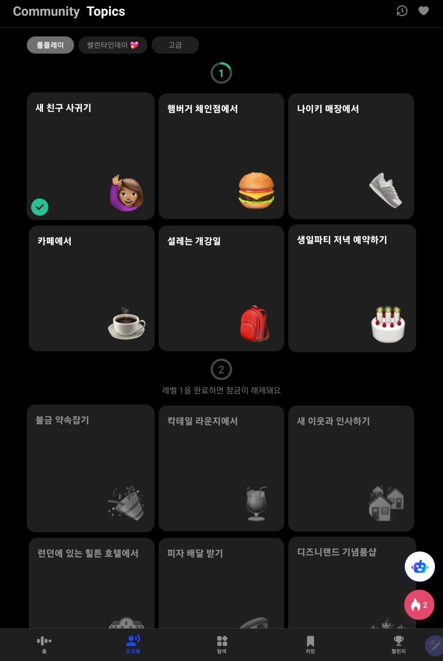 그리고 프리톡의 경우는 AI랑 다양한 실제상황들을 롤플레잉 형식으로 학습해 나가는 과정으로, 아래와 같이 주제가 굉장히 다양합니다. (약 500개 정도)