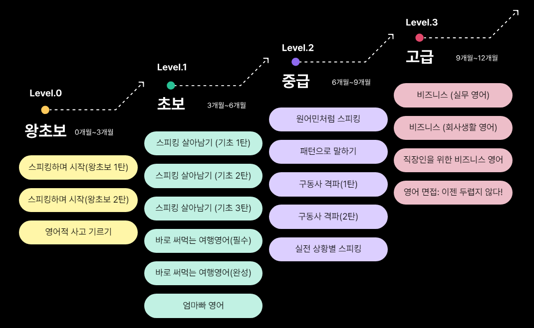 그리고 커리큘럼도 왕초보부터 비즈니스 단계까지 구성되어 있기 때문에, 아이들이랑 같이 하시기에도 좋고 이미 회화를 능숙하게 하시는 분들도 커리어 향상 목적으로 하기에도 좋습니다.